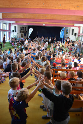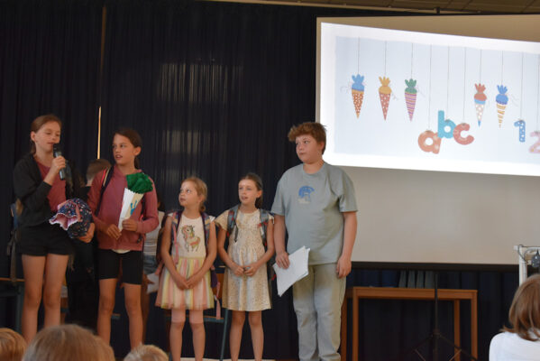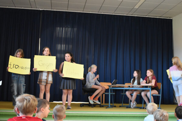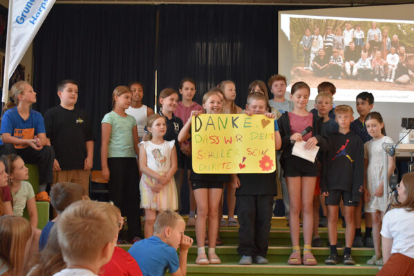 Bei der Abschlussfeier in der Aula wenige Tage später präsentierten die Viertklässler ein kurzweiliges Quiz zur Grundschulzeit, zwei auf Schule umgedichtete Hits und einen weiteren Rückblick auf die Grundschulzeit, bevor sie mit einem Geschenk ihrer Patenklasse 2 aus der Aula verabschiedet wurden.