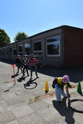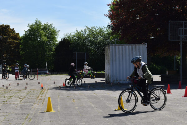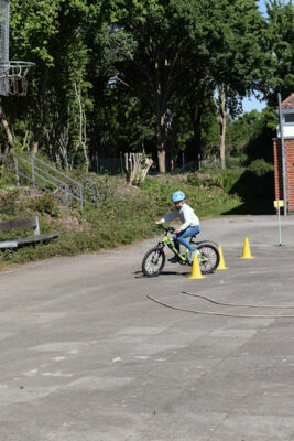 Besonders spannend war die Slalom-Strecke. Hier mussten die Schülerinnen und Schüler mit ihren Fahrrädern geschickt um die aufgestellten Hindernisse manövrieren. Dabei lernten sie, wie wichtig es ist, auch bei engen Kurven sicher und kontrolliert zu fahren.