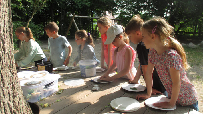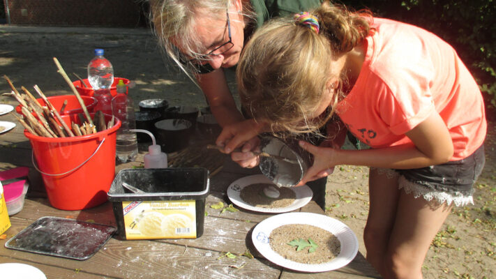 Abschließend durften die Kinder ihren persönlichen Blattabdruck mit Gips sowie Frottage-Bilder anfertigen und natürlich auch ein paar thematische Kooperationsspiele spielen.
