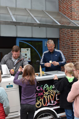 Der Schülerrat verkaufte den von Eltern gespendeten Kuchen und das Eiscafé Venezia belohnte die Kinder nach getaner Arbeit gemeinsam mit der Firma Roland Manufaktur Harpstedt mit leckerem Eis, das Inhaber Marcel Degner unter mithilfe des Schulleiters verteilte.