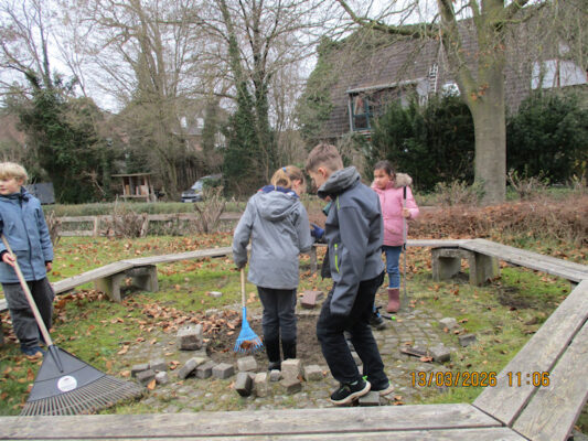 Mit viel Einsatz wurden Unkraut und Laub entfernt, neue Buchenhecken gepflanzt, Zäune wieder befestigt oder sogar neu installiert sowie die Kräuterspirale neu bepflanzt. Außerdem wurde frischer Rindenmulch verteilt, sodass viele Bereiche unseres Schulhofs nun noch gepflegter und einladender wirken. Auch die nähere Schulumgebung wurde von unseren Schülerinnen und Schülern und den dazugehörigen Lehrern von Müll befreit und gereinigt.