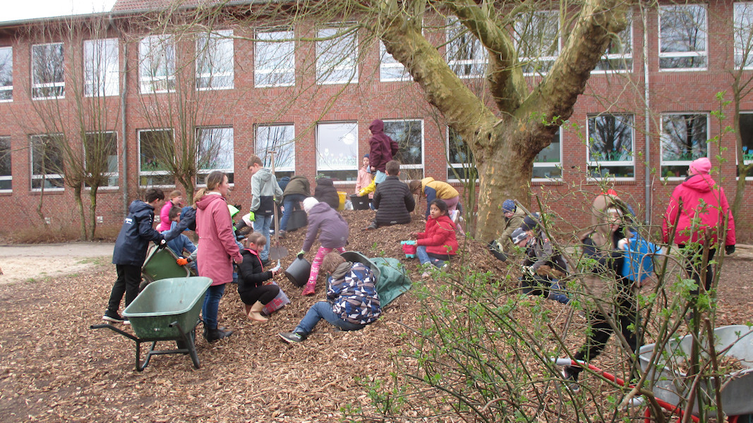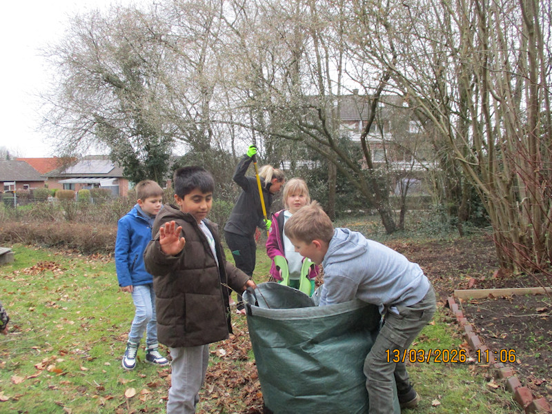 Mit viel Einsatz wurden Unkraut und Laub entfernt, neue Buchenhecken gepflanzt, Zäune wieder befestigt oder sogar neu installiert sowie die Kräuterspirale neu bepflanzt. Außerdem wurde frischer Rindenmulch verteilt, sodass viele Bereiche unseres Schulhofs nun noch gepflegter und einladender wirken. Auch die nähere Schulumgebung wurde von unseren Schülerinnen und Schülern und den dazugehörigen Lehrern von Müll befreit und gereinigt.